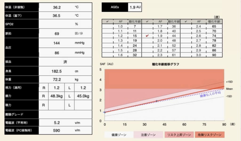 簡単な問診票の記載とともに、血液検査だけでなく、握力検査、糖化年齢検査、電磁波の体内残留量を測定する検査も行いました。検査自体は15分ほどで終わりました。
